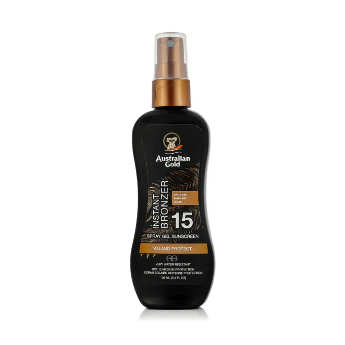 Australian Gold Instant Bronzer Spray SPF 15 – tai apsauginis saulės purškiklis su lengvu bronzavimo efektu, suteikiantis odai natūraliai įdegusios odos atspalvį iš karto po užtepimo. Formulė sukurta taip, kad vienu metu apsaugotų nuo UV spindulių ir suteiktų švytinčios, „auksinės“ odos efektą.